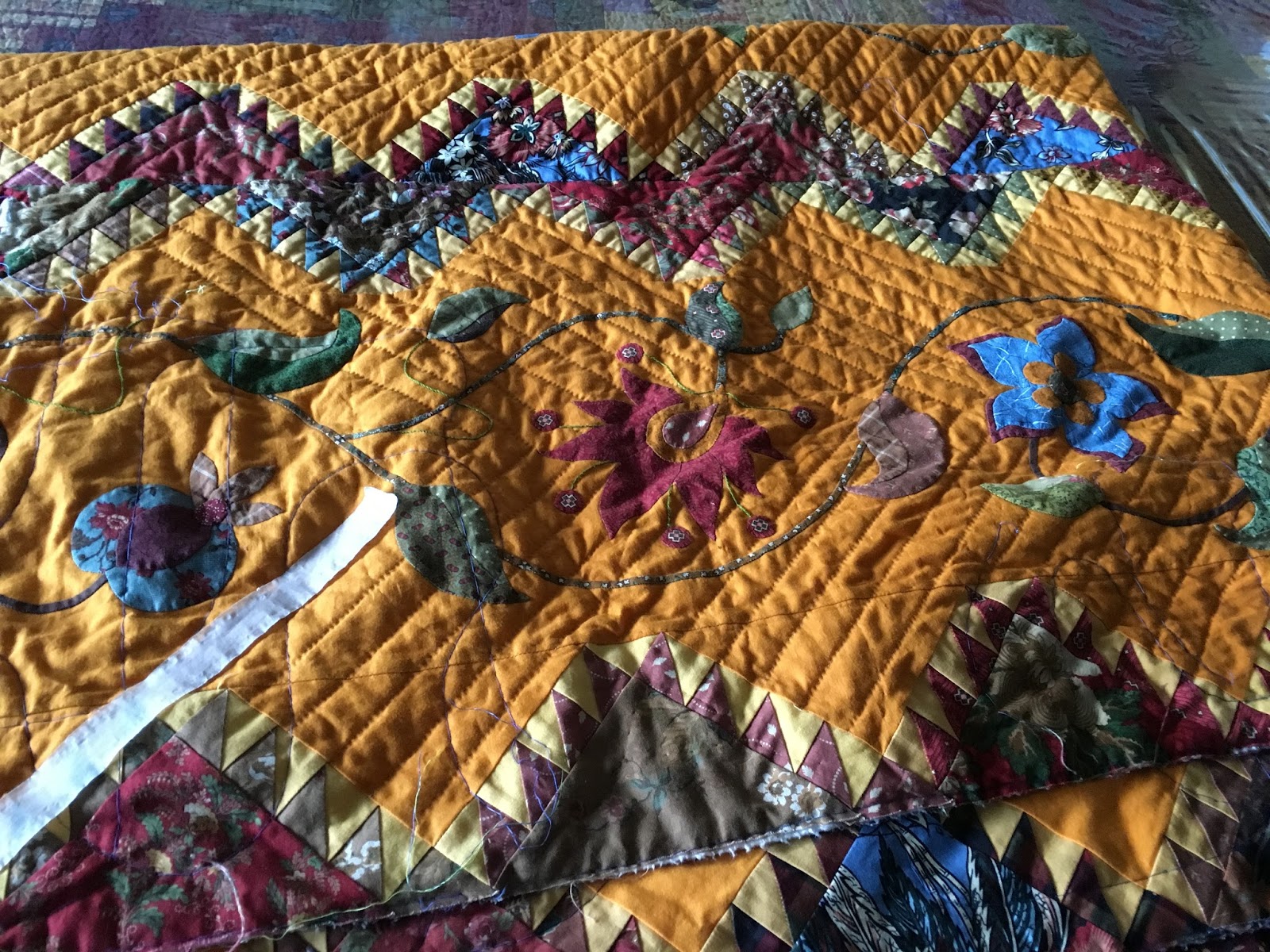 The hand-quilting on the center panel and the Delectable Mountain blocks of my Sistine Chapel quilt was done when the week started. I managed to complete the second panel of the three during the week.