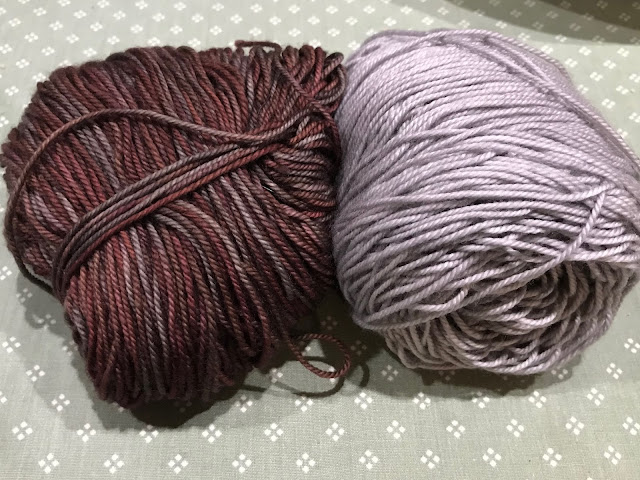 I immediately thought of the upcoming Mystery Knit Along for the Rose City Yarn Crawl. I'm unlikely to be going, since it will be in March, but it could happen, and there's no reason I can't participate in the KAL. The pattern, Meditations, calls for two colors. Variegated is not recommended, because the stitches need to stand out. The uneven coloration in hand-dyed or kettle-dyed yarns is good, though. The two colorways should have good contrast, just like in a quilt. I gave Knotty Lamb a call, since that's where my yarn came from, and asked them if their "Bark" from the same line of yarn would look OK with "Painted Hills." The person I talked with, who put down her knitting to help me, thought it would be a good choice, so it's on its way to me. Here's how it looked on their website.