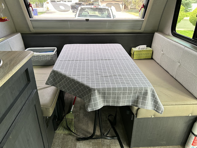 Let's start this blog post with some projects, since I'm "High Fiber." The table in our RPod isn't fastened to anything. I guess the idea was that we could take the table outside to eat, if we didn't have a picnic table in our campsite. Good idea, which we have't ever tried out. To keep the table in place when we're moving, there's a strap that fastens to the seats on each side of the dinette, that goes over the top of the table. We usually store our wine and beer under the table, so that helps keep it from moving around too much, also. However, it rubs against the front wall, right under the window, so we've taken to using a tablecloth to protect the wall. The tablecloth was too big, so I decided to make one to fit it. We picked up the fabric at Walmart, and I cut it and hemmed it all around the edges. (The hummingbird feeder hangs out in the dinette area when not in use.)